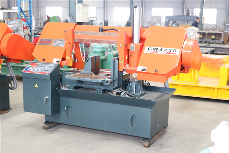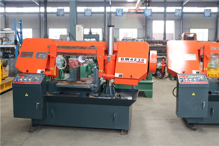 锯条传动安装在蜗轮箱上的电动机通过皮带轮,三角胶带驱动蜗轮箱内的蜗杆和蜗轮,带动主动轮旋转,再驱动绕在主动被动轮缘上的锯条进行切削回转运动。锯条进给运动由升降油缸和调速阀组成的液压循环系统,控制锯梁下降速度从而控制锯条的进给(无级调速)运动。锯刷旋转在锯条出屑的地方,并随着锯条走锯的方向旋转,并由冷却泵供冷却液清洗,清除锯齿上的切屑。冷却液在底座的右侧冷却切削液箱里,由水泵直接驱动供冷却液。